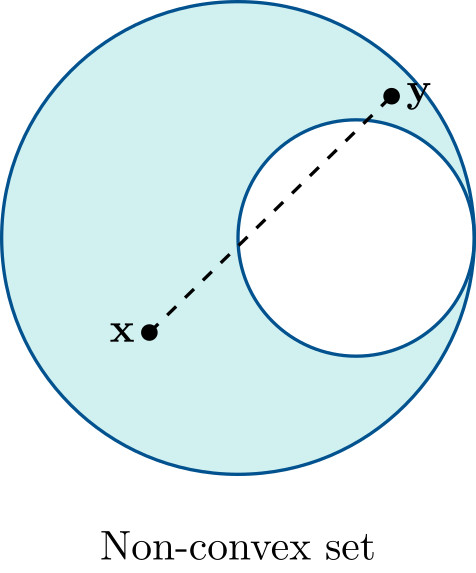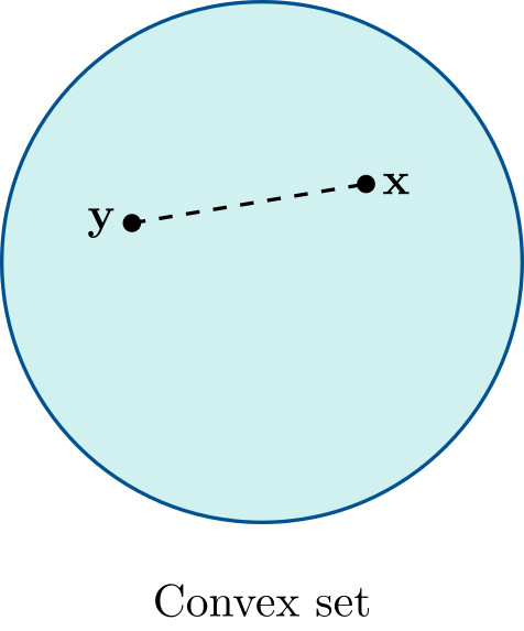 \[\lambda \mathbf{x} + (1-\lambda)\mathbf{y} \in \mathcal{C} \qquad \forall \mathbf{x},\mathbf{y}\in\mathcal{C},\; \forall \lambda\in[0,1].\]